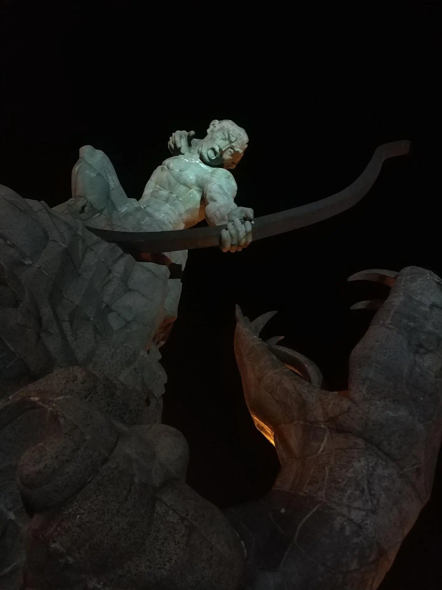 洞庭湖旁的广场上,昏黄的路灯围绕着一尊巨大的雕塑。一条蛇张着大嘴,像是要将对面这个使他愤怒又惊恐的拉满弓的人类吞噬。广场上剑拔弩张,湖面却平静得出奇,没有汹涌的潮水,只有在零星的灯光映照下的粼粼波光,通向码头的桥将这波光分作两片。