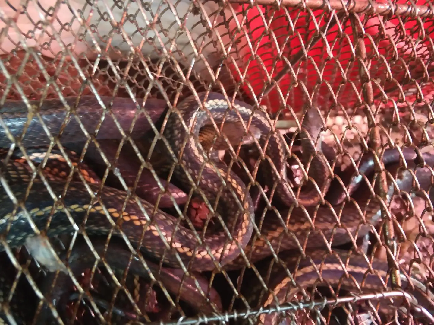 王二晚上睡得很晚,第二天中午才醒,又在床上躺了很久。外边的阳光照得王二睁不开眼,他往前走着,遇到红灯便向右走,走过不知多少个路口,再抬头看,两边都是低矮的房屋,沥青路上坑坑洼洼,一大片铁棚遮住下边摆摊的小贩。王二看到入口处一个铁笼里,几条扭动的蛇吐着信子,黑色背上闪着油光,又夹杂着白色的花纹。旁边一个摊,装着两袋子绿色的青蛙,老板娘坐在大案板后,肚子的轮廓清晰可见,胸前的两团肉低垂着,差点与肚子连成一片。老板娘用剪刀剪着面前的一堆黄红相间的肉,桌子上还有一袋子鳖,一动不动,毫无生气。