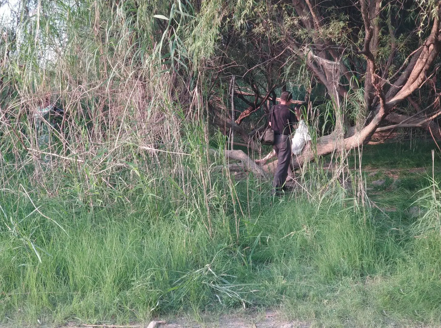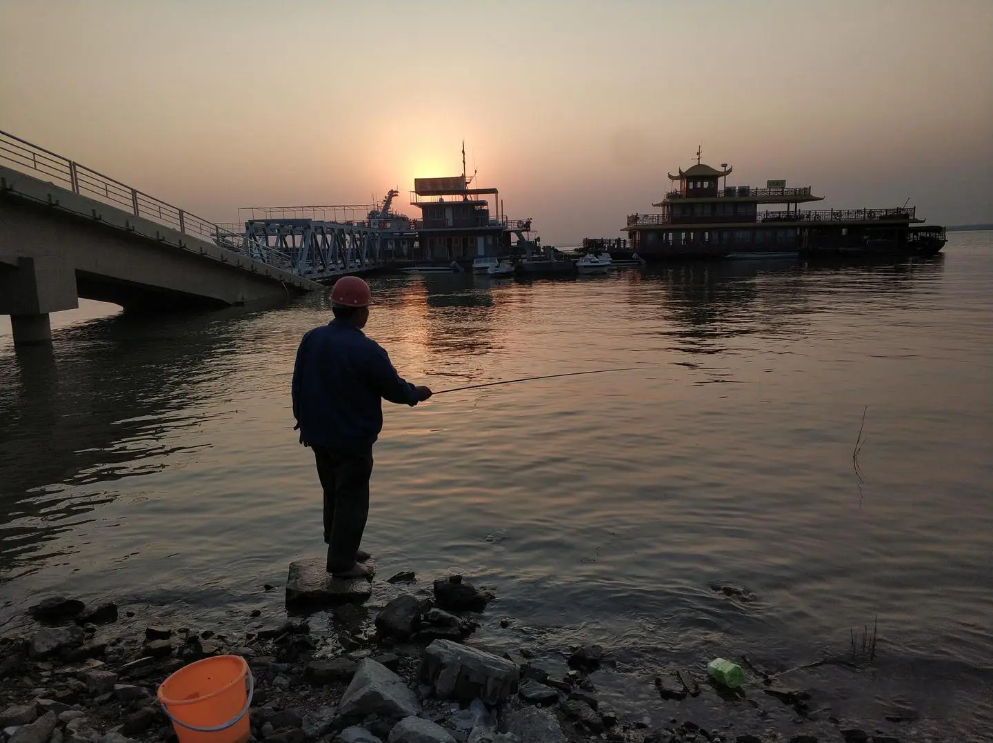 前面一大片都是芦苇,比人还高,靠近大堤有一棵歪腿树。再往前走,经过两个码头,目之所及之处只有一个人,他戴着安全帽,穿着蓝色工服,赤脚站在湖边石头上,一只手向前握着伸出去的鱼竿。这里的水面很平静,没有一点波纹,湖水很浅,看得到近处湖底的石头。