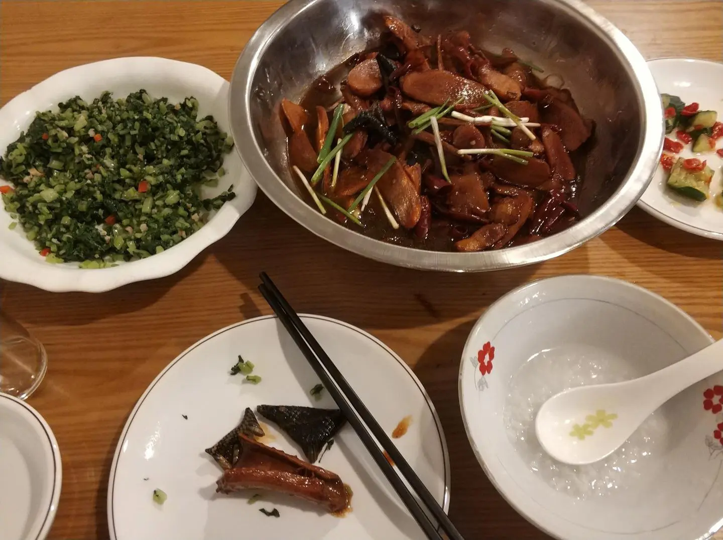 这里的鱼火锅很大量,又实惠,整条鱼躺在锅里,尾巴伸在外边,汤色半透明偏绿,浮着油光,里边有一夹就断的豆腐,有酸酸的腌菜,肉质很嫩,煮到最后,鱼肉刚放到嘴里就化了。三斤鱼就这样进了肚子,还有一大碗粥。