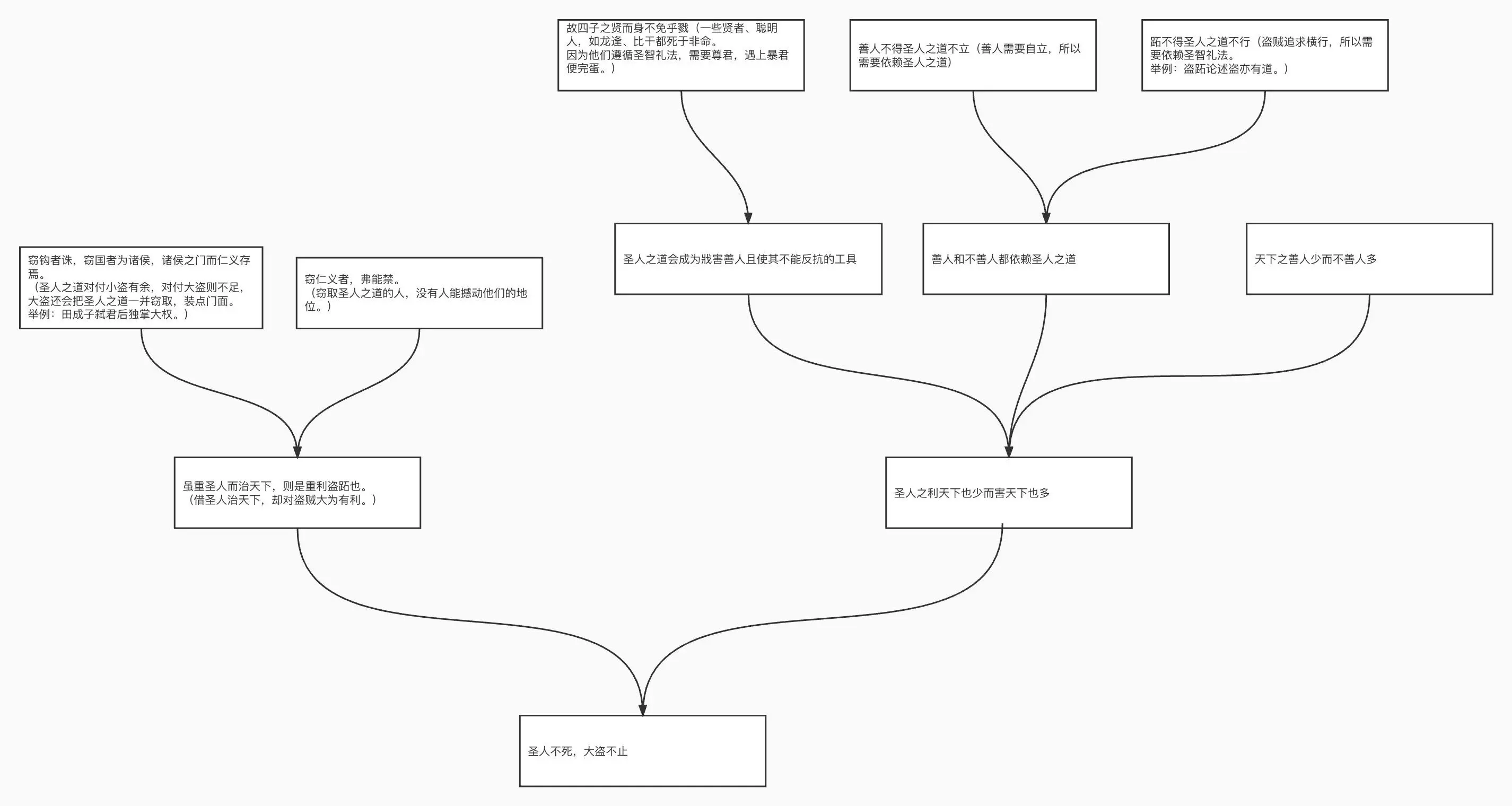 原文分为两部分,第一部分讲述圣人之道也就是圣智礼法如何成就大盗,得出“圣人不死,大盗不止”的结论;第二部分讲述如何绝圣弃智。