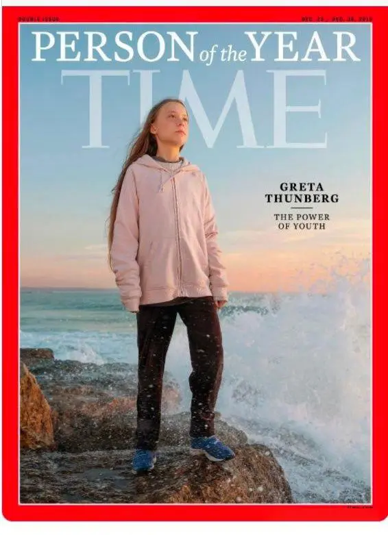 而环保少女正是在环保成为舆论正确的背景下成为西方世界的一面大旗,她的一些针对发展中国家的环保言论成为西方政客攻击发展中国家的子弹。下图为她被评为2019《时代周刊》年度人物的图片。