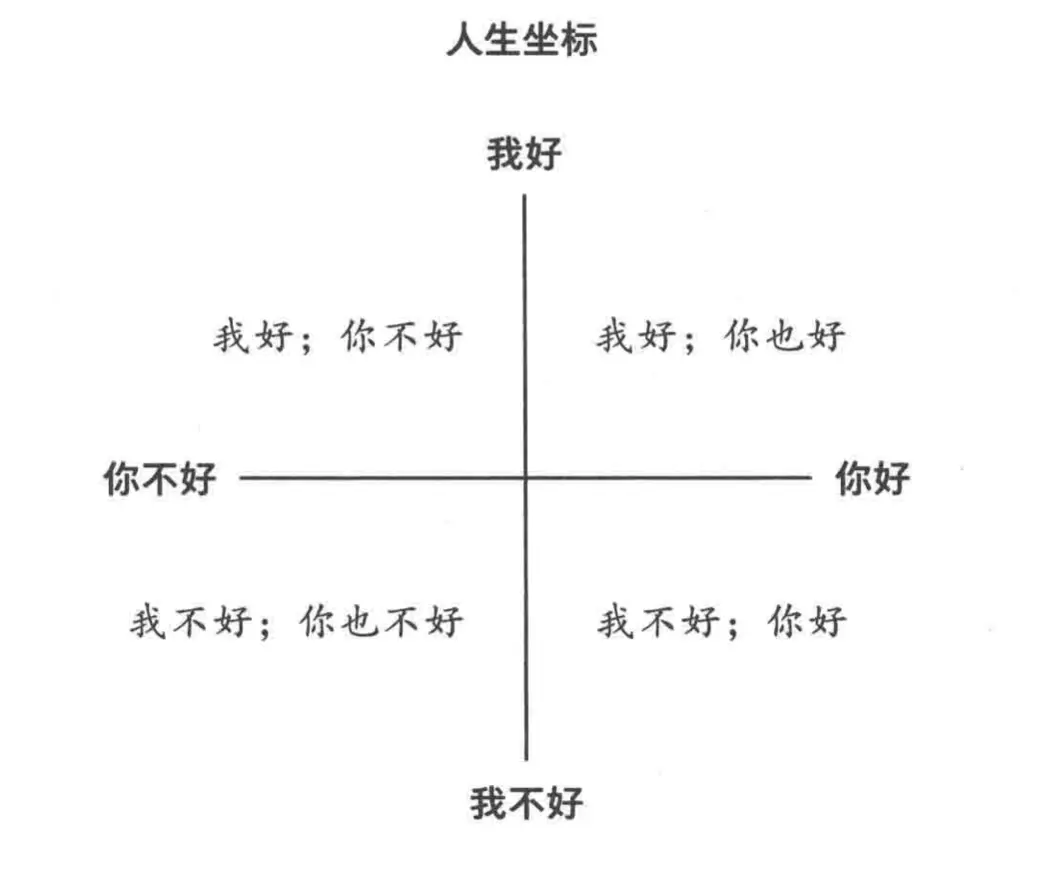 预期就是对世界的看法,包含在性格里边。同时,人对世界的看法意味着两方面,简言之:我们如何看待自己,好或者坏;我们如何看待别人,好或者坏。这两个维度有四种搭配,画在坐标系中就是下图的人生坐标: