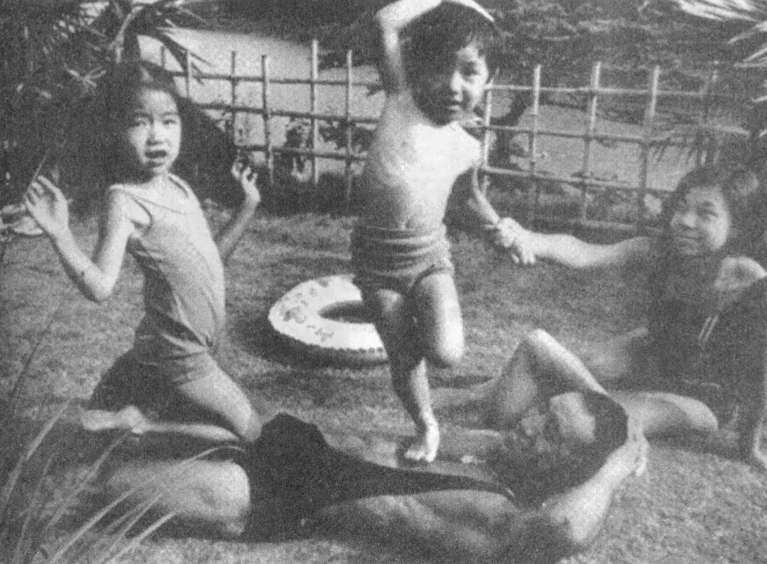 下图是三岛的两个孩子(左边的两个)在他身边玩耍: