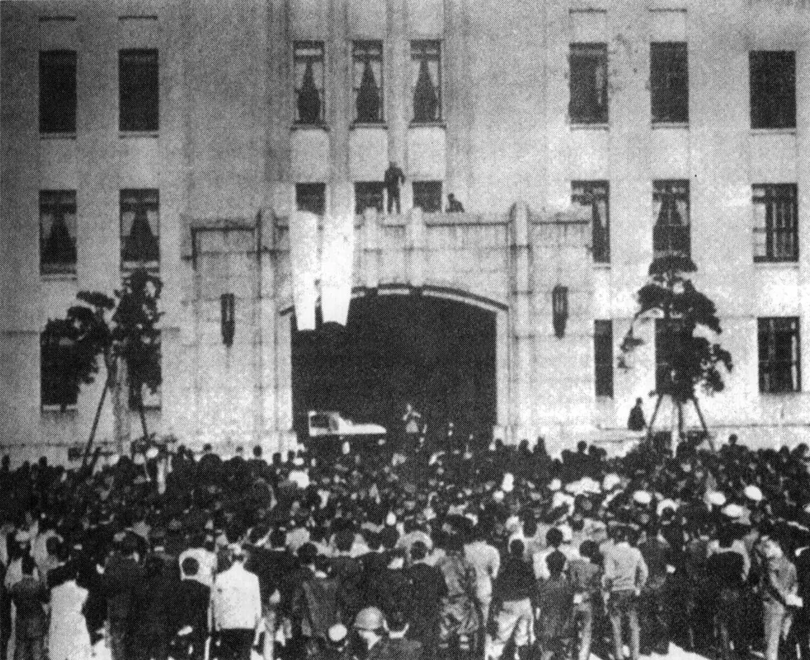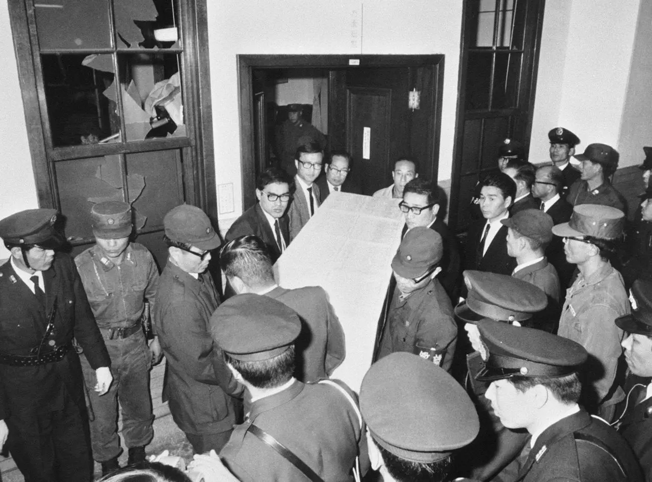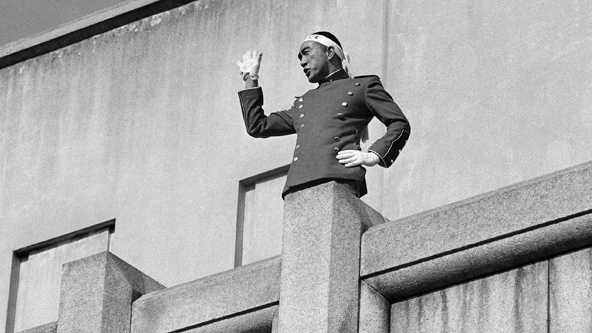 1970 年 11 月 25 日早上,三岛由纪夫最后一次走出家门,他在桌子上留了张纸条,上面写着:“人的生命是有限的,但我想永远地活下去。”之后带着四个盾会(三岛组建的小型右翼军事团体,接受自卫队的训练)成员前往东京某自卫队基地,假借与驻地的益田司令交流盾会训练的名义,绑架益田,胁迫其召集驻地全部的一千多名官兵,在二楼的阳台上发表爱国讲话《檄文》,呼吁自卫队成员武力反抗《和平宪法》(这部战后和美国占领军一起确定的宪法的第九条规定,日本不能拥有正常军队,只能拥有防卫性质的自卫队):