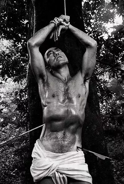 之后,三岛和情色摄影师筱山纪信也拍过一组,《男の死》,这一组从布景、选材都是三岛亲自设计安排的,让筱山纪信觉得自己只是个按快门的。从 1969 年开始拍摄,时间跨度一年。最后一张照片拍下一周后,便发生了三岛事件。其中比较著名的一张是模仿三岛曾对着射精的名画《圣塞巴斯蒂安殉道图》的: