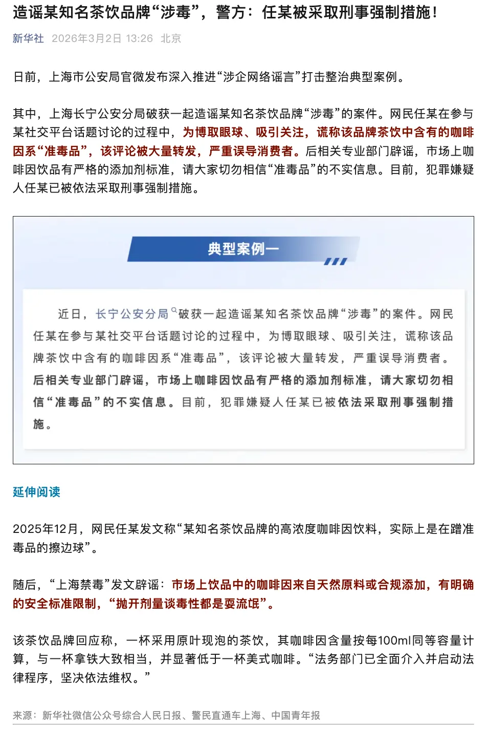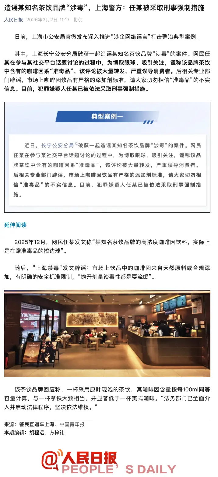 3月2日新华社、人民日报等官媒公众号发文称,马督工(也就是新闻标题中的任某)造谣霸王茶姬“涉毒”,被采取刑事强制措施,B站上的自媒体也有相关报道。